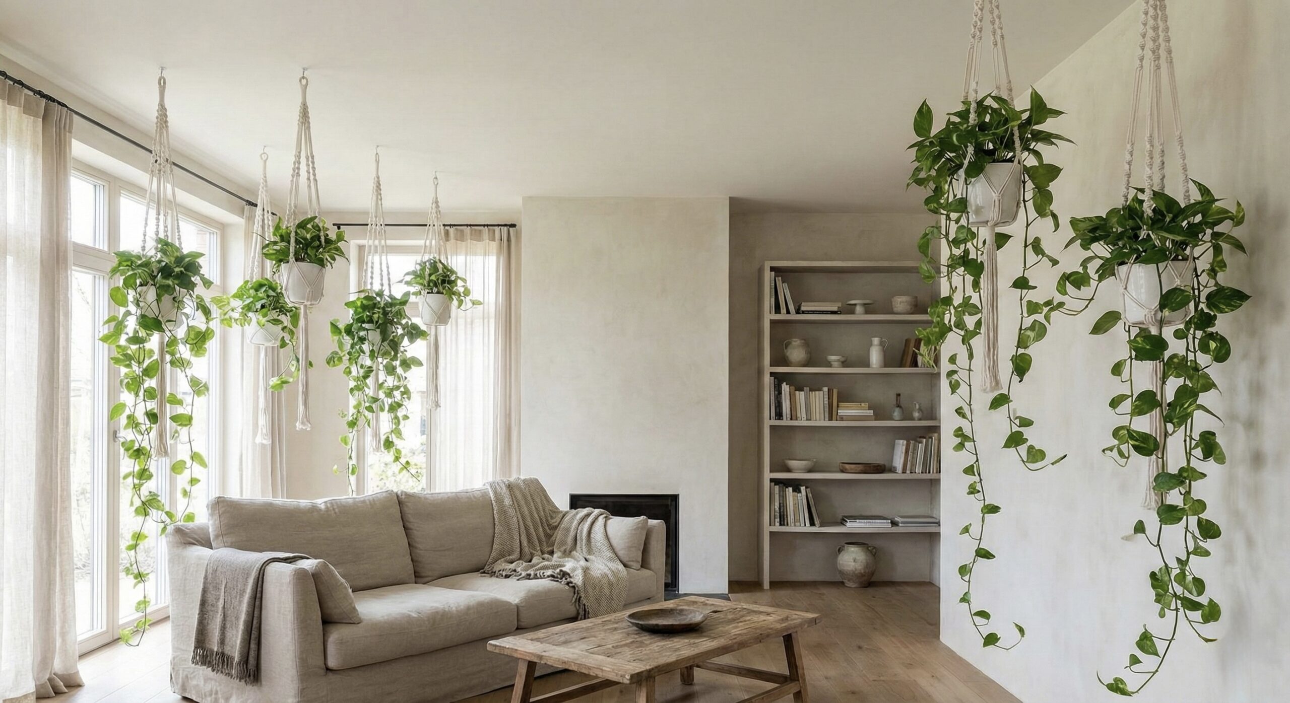 視線の高さに緑が来ることで、お部屋のどこにいても植物が目に入り、リラックス効果が高まります。マクラメ編みのハンガーや、無機質なスチール製のポットなど、器次第で印象を自在に変えることもできます。