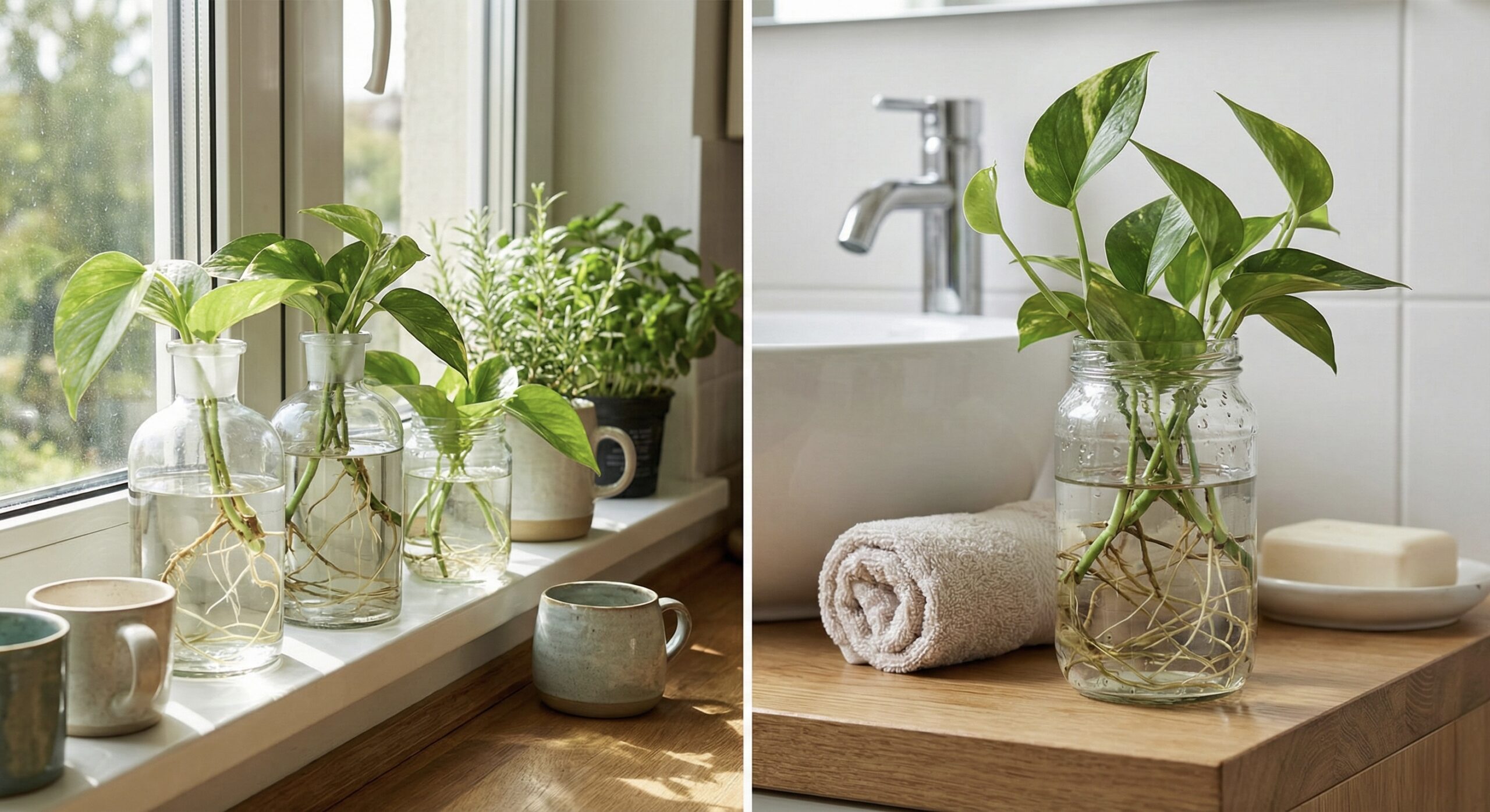 ポトスはカットしたつるを水に挿しておくだけで、簡単に根を出して育ってくれます。清潔感があり、土を使いたくない水回りをおしゃれに彩るのにぴったりな飾り方です。